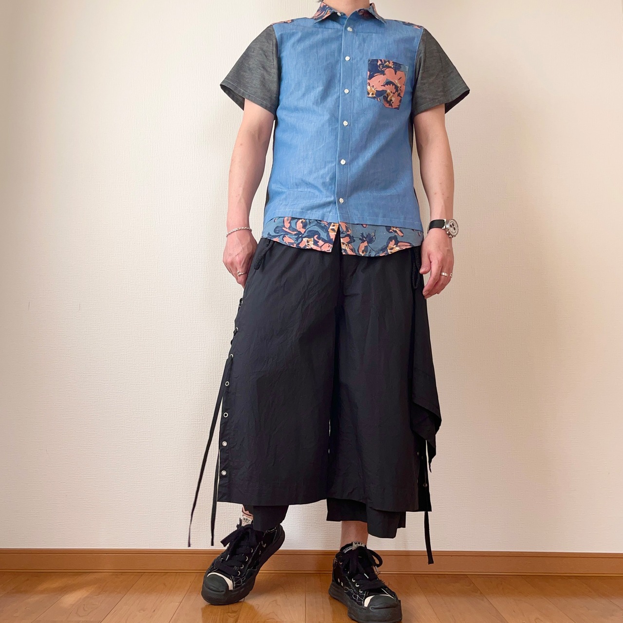 お洒落な花柄の生地と上質なダンガリーを使って遊び心のある半袖シャツを作りました。