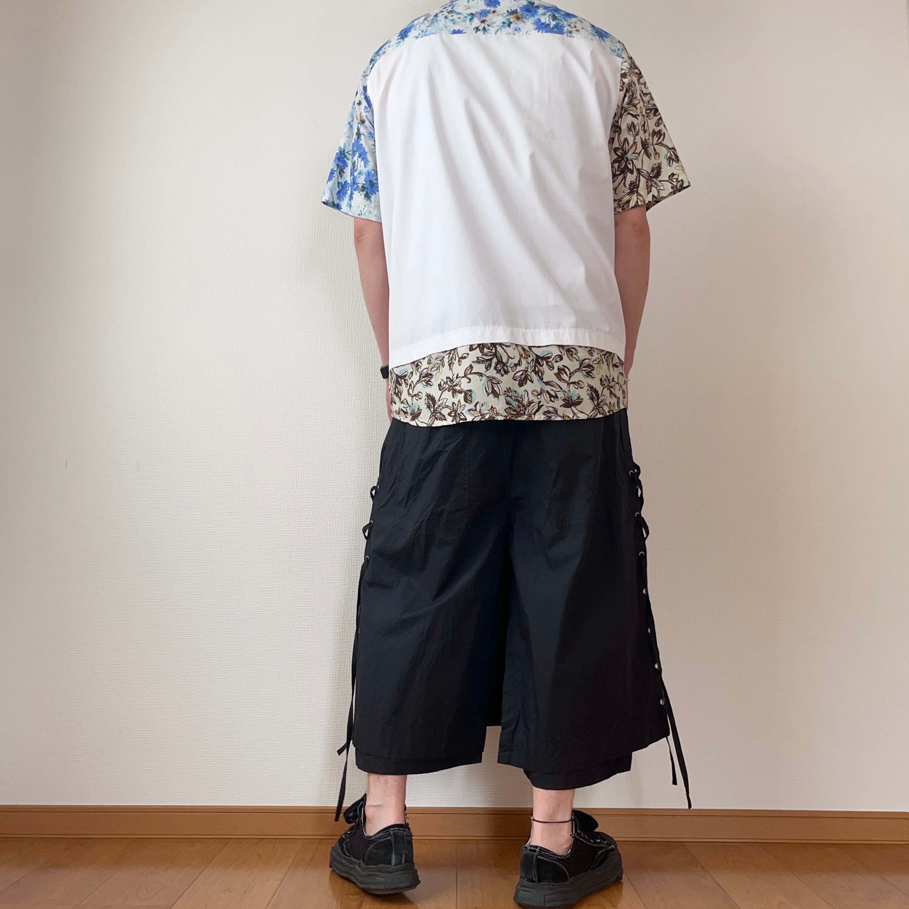 ベージュとブルーの花柄プリントと白無地の生地で切り替えたシャツを作りました。